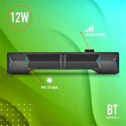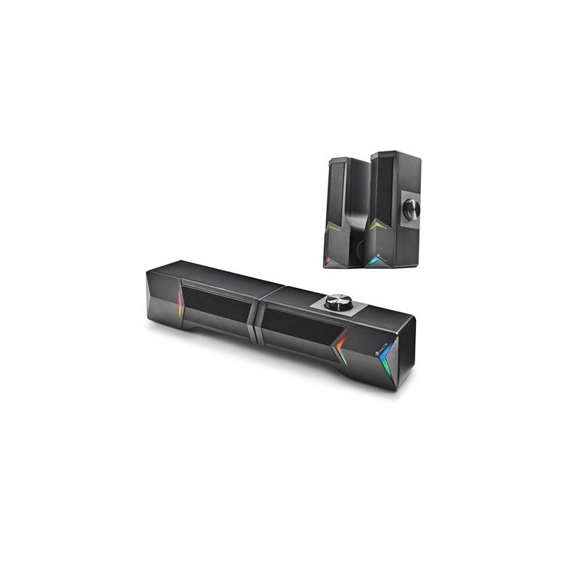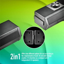 Barra de sonido de gaming compatible con tecnología Bluetooth ideal para laptop, PC, smartphone y Tablet. Su diseño versátil le permite funcionar además como un compacto juego de altavoces 2.0 independientes con potencia de salida de 12W alimentado por USB. Conecta tu dispositivo a través del Bluetooth o de la entrada jack 3.5 mm y disfruta de un sonido potente y nítido. Incluye luces LED.