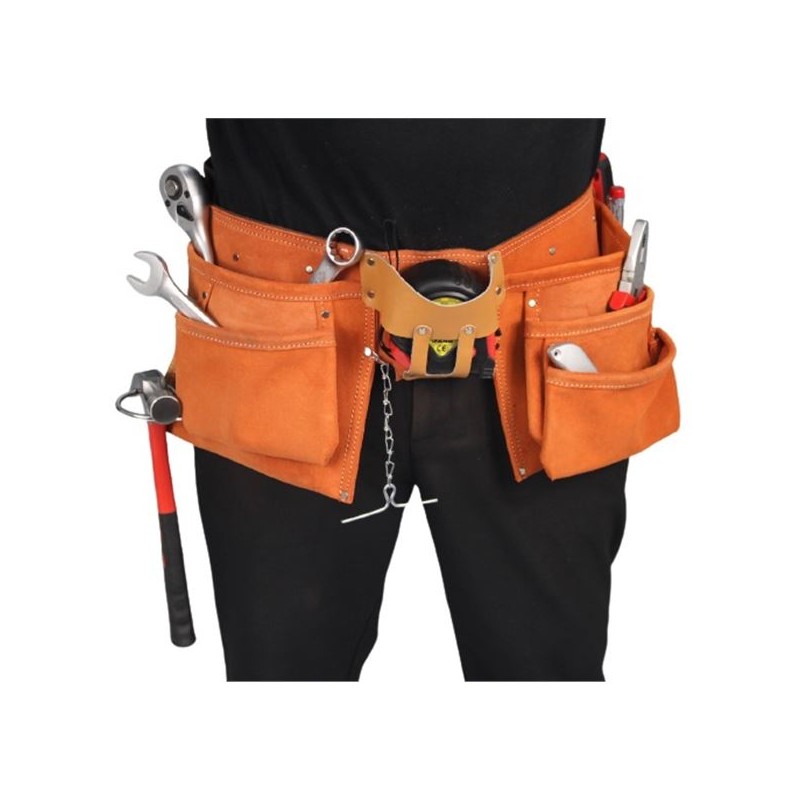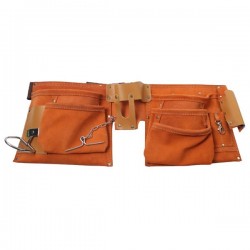 Diseño de cinturón de trabajo de 2 bolsas con 10 particiones con cinturón ajustable de poliéster, además de una trabilla metálica para colgar martillos.