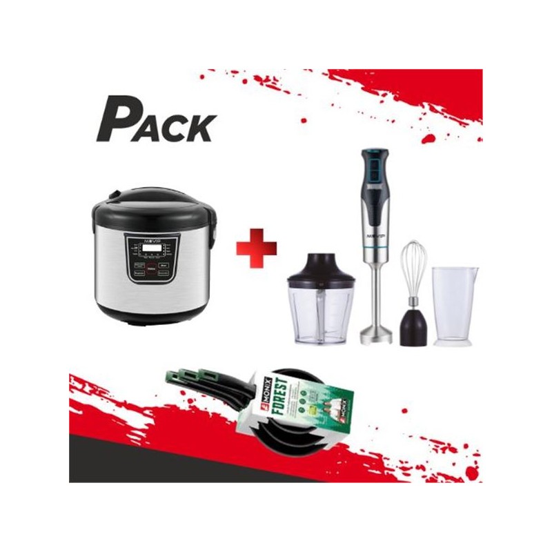 Pack compuesto de Olla + Batidora de mano con accesorios + Juego de 3 Sartenes