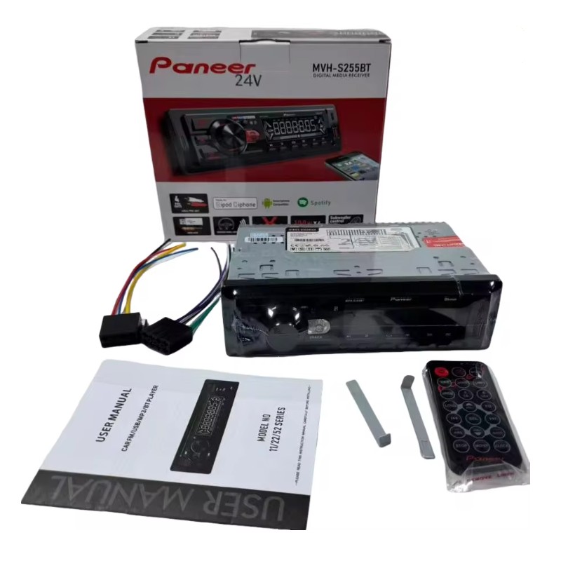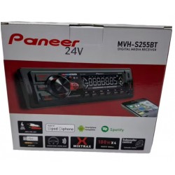 Pioneer MVH-S255BT Estéreo Bluetooth de un DIN con USB integrado, reproductor de MP3, 24V 100W, radio AM/FM auxiliar, compatible con smartphones y Spotify.
